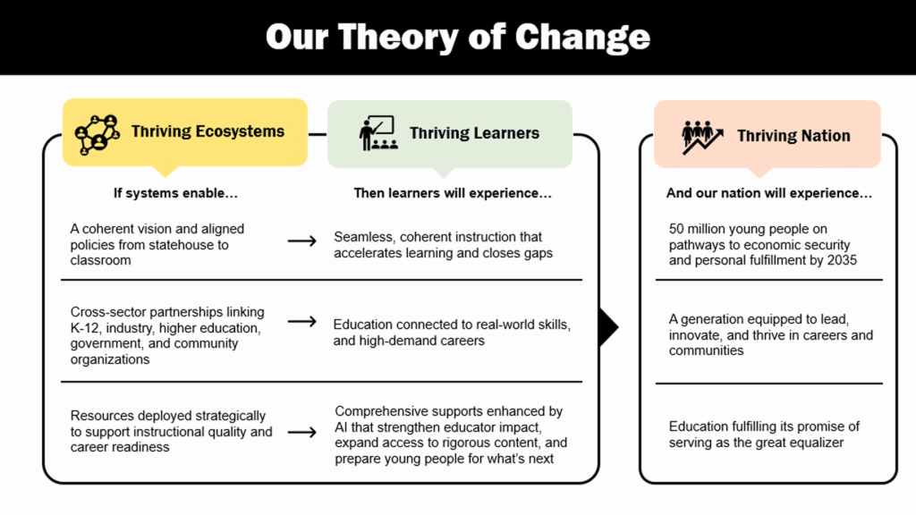 The other is a theory of different action — our TODA — which represents a fundamental shift in how we create change. It will be designed to support our goal – 50 million young people on a path to economic security and individual agency. Rather than convincing existing systems to change, we’ll build a national movement of educators, families, and civic leaders to co-create the schools America needs to transform at scale. We’ll prototype solutions with communities, prove what’s possible, and create pressure from the grassroots up and the grasstops down to redesign the system itself.
