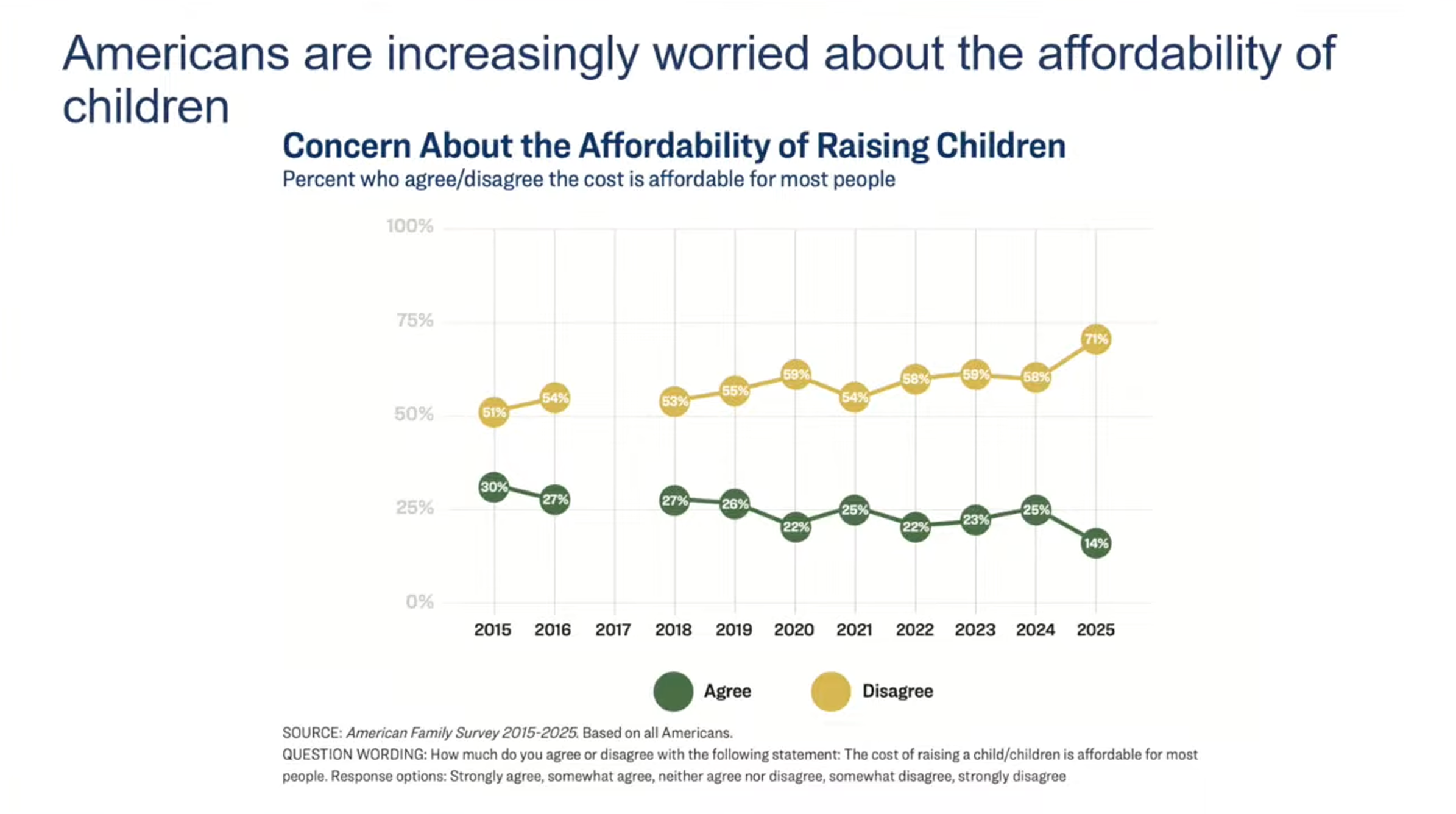Parenting today feels like a ball of contradictions: be present but not hovering, responsive but autonomy-supportive, lean into their interests but get out of their way. While technology helps us work and stay connected, it’s turned homes into battlegrounds over screens, social media, and gaming. Anchors that parents once clung to – reliable schools, college as a predictable pathway, jobs for those who worked hard – have loosened, or become unmoored. Even the simple reality of having kids feels out of reach for many: 71% of Americans disagree that raising children in America is affordable. In 2015 that figure was 51%.