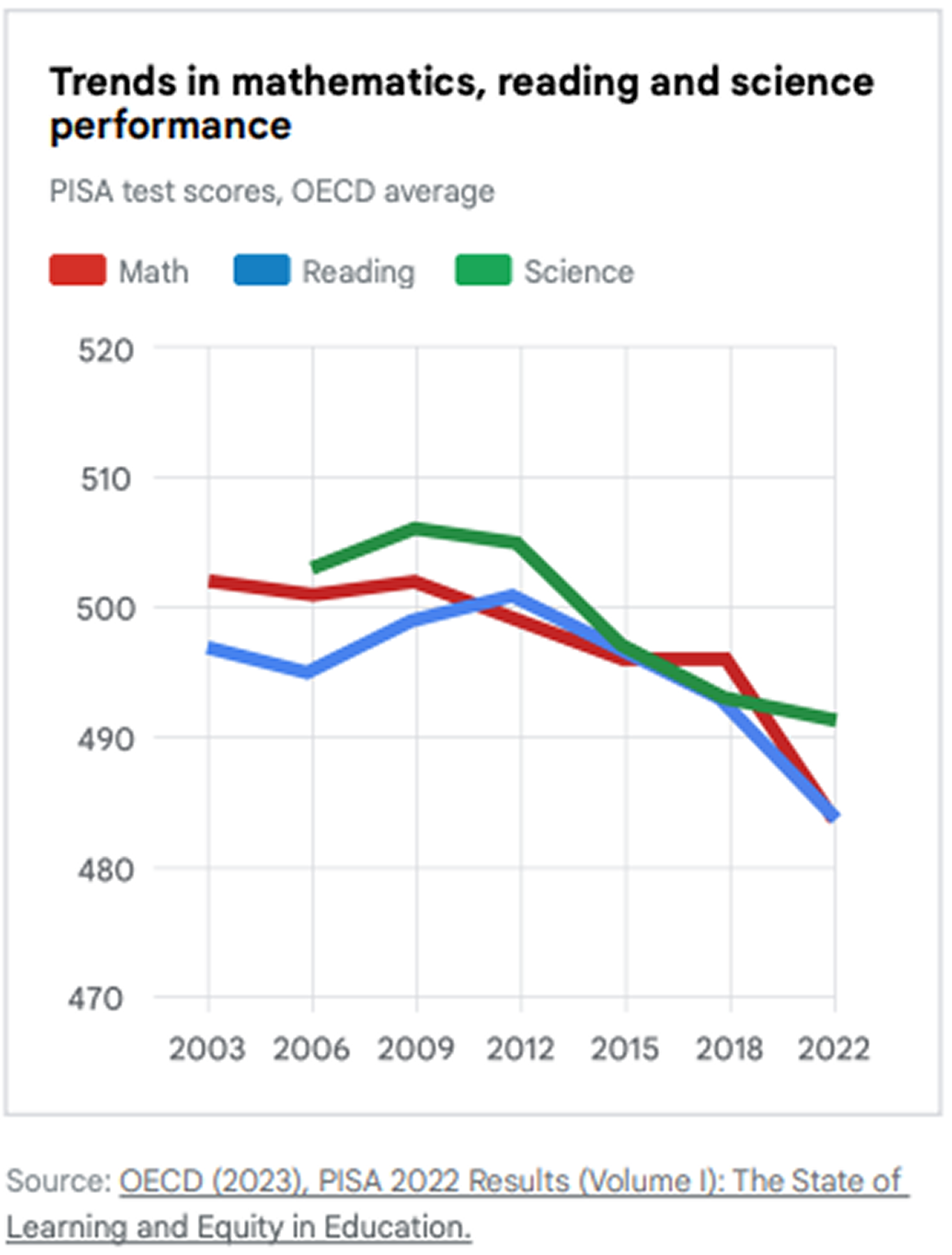 Despite billions invested in education, performance on PISA and NAEP, among other tests, is falling.
